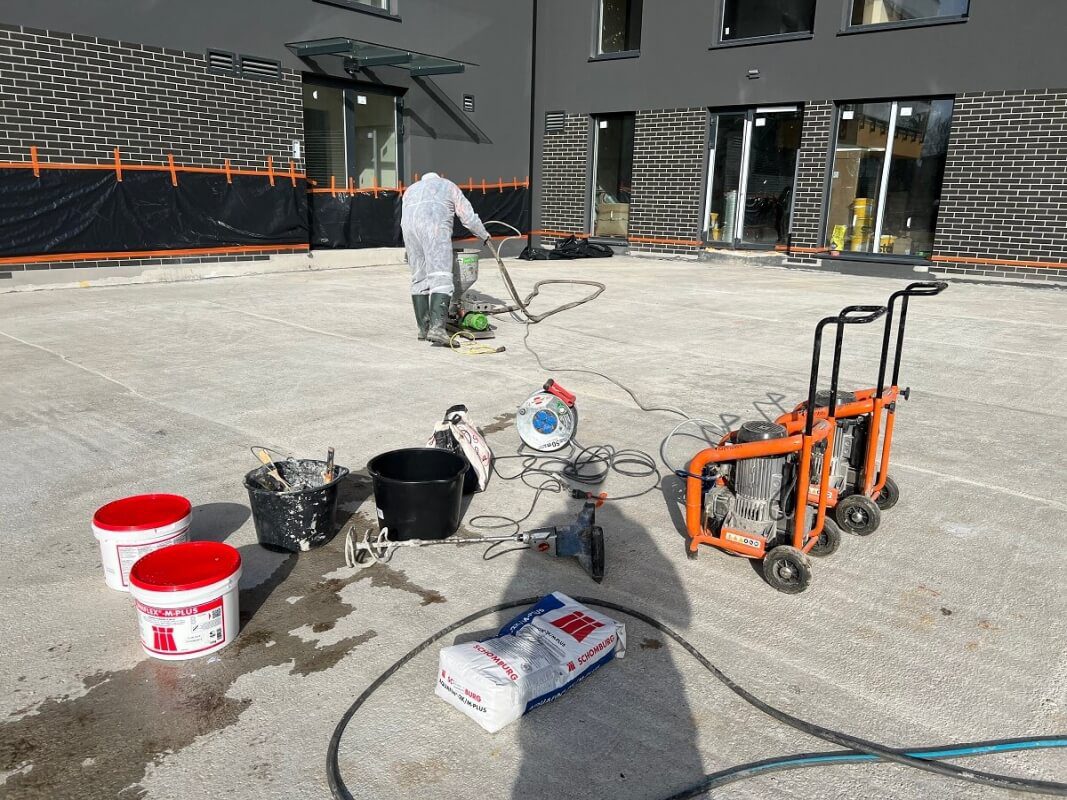 Pracownik wykonuje izolacje tarasów na dużej betonowej powierzchni przed budynkiem, korzystając z narzędzi i materiałów budowlanych.